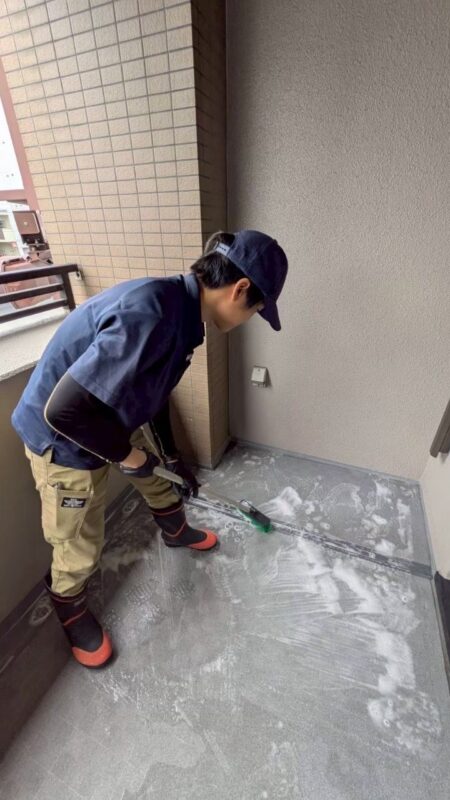 続いてベランダの床も高圧洗浄や手洗いでクリーニング。