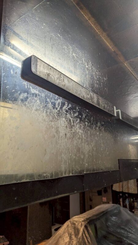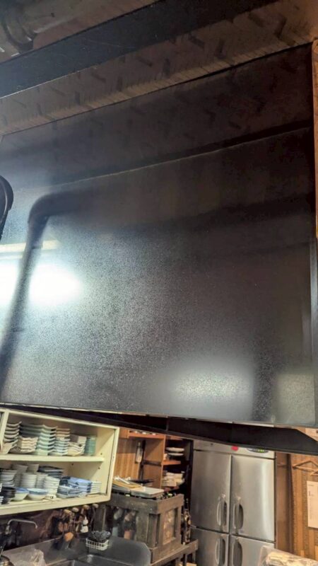 作業前は、レンジフード内部やフライヤー周辺に長期間蓄積された油汚れや焦げ付きが目立つ状態でした。